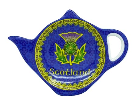 Add a bit of Scottish charm to your tea time with our Ceramic Golden Thistle Tea Bag Holder. This beautifully crafted piece, shaped like a teapot, features a detailed thistle flower at its center, surrounded by a Triskelion and intricate Celtic knotwork. The thistle, Scotland’s beloved national emblem, comes with a legendary tale: it's said that a prickly thistle once saved Scotland from invasion when an enemy soldier stepped on it, raising the alarm. Ever since this tough little flower has stood for resilience and protection. At the heart of the thistle design is a Triskelion, an ancient Celtic symbol with three interlocking spirals. It represents the cycle of life, earth, water, sky, and the flow of time through past, present, and future. The surrounding Celtic knots add even more meaning, symbolizing eternity and the unending journey of life.