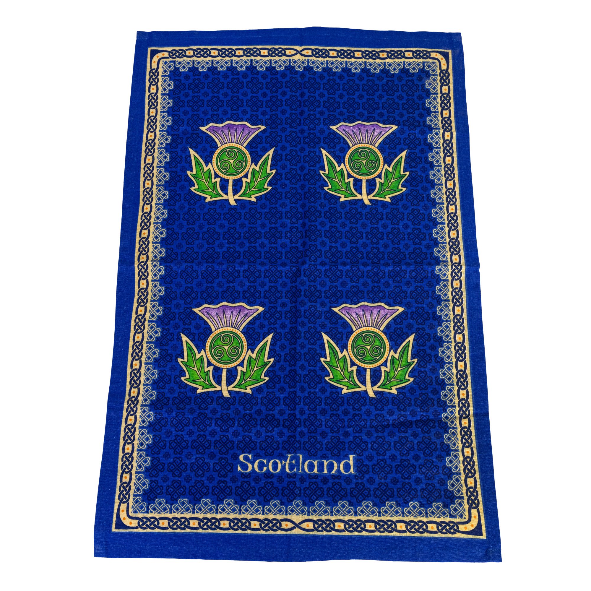 Our Flower of Scotland Thistle Tea Towel is a striking piece that blends rich symbolism and practical design. Adorned with intricate golden thistles, the national emblem of Scotland, this tea towel pays homage to Scottish heritage and history. At the heart of each thistle lies a delicate triple spiral pattern, further enhancing the design’s Celtic roots. Bordering the thistles are intricate, never-ending knot margins that represent eternity and the enduring connection between past, present, and future - a beautiful suggestion of the idea of interconnectedness.