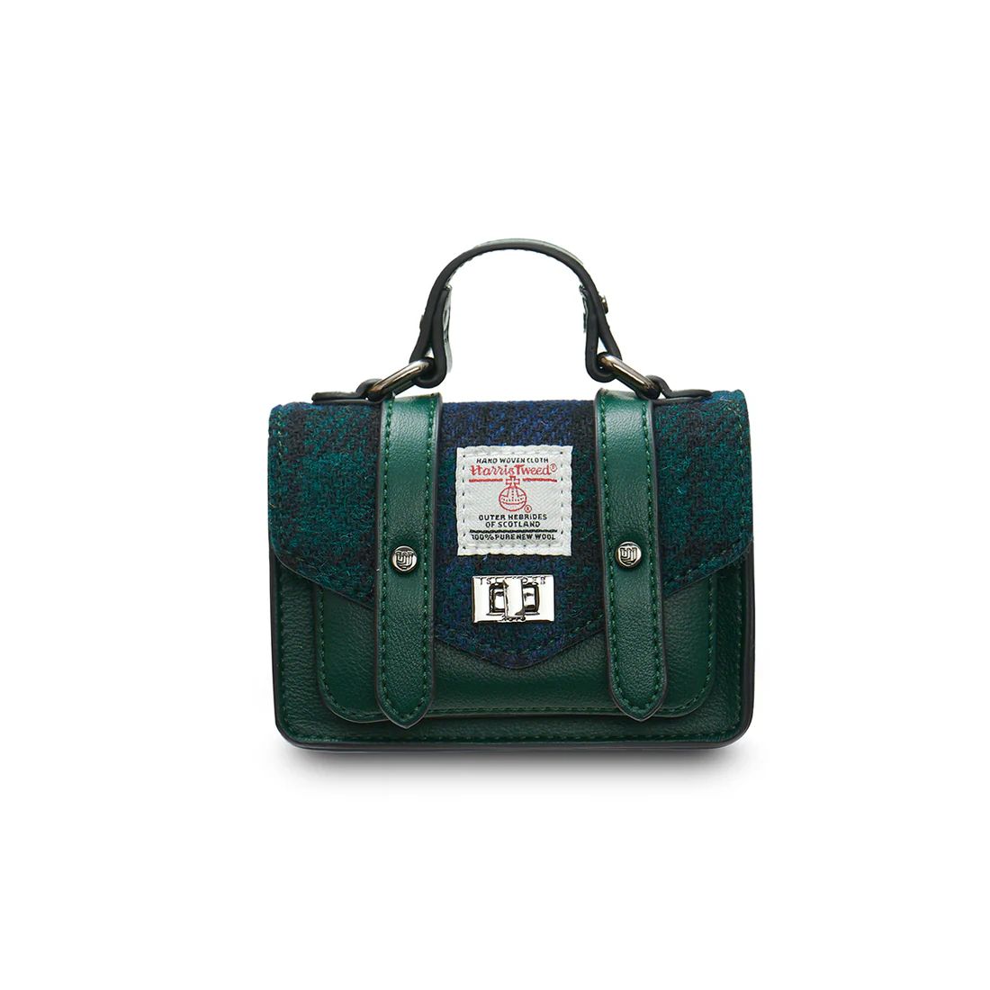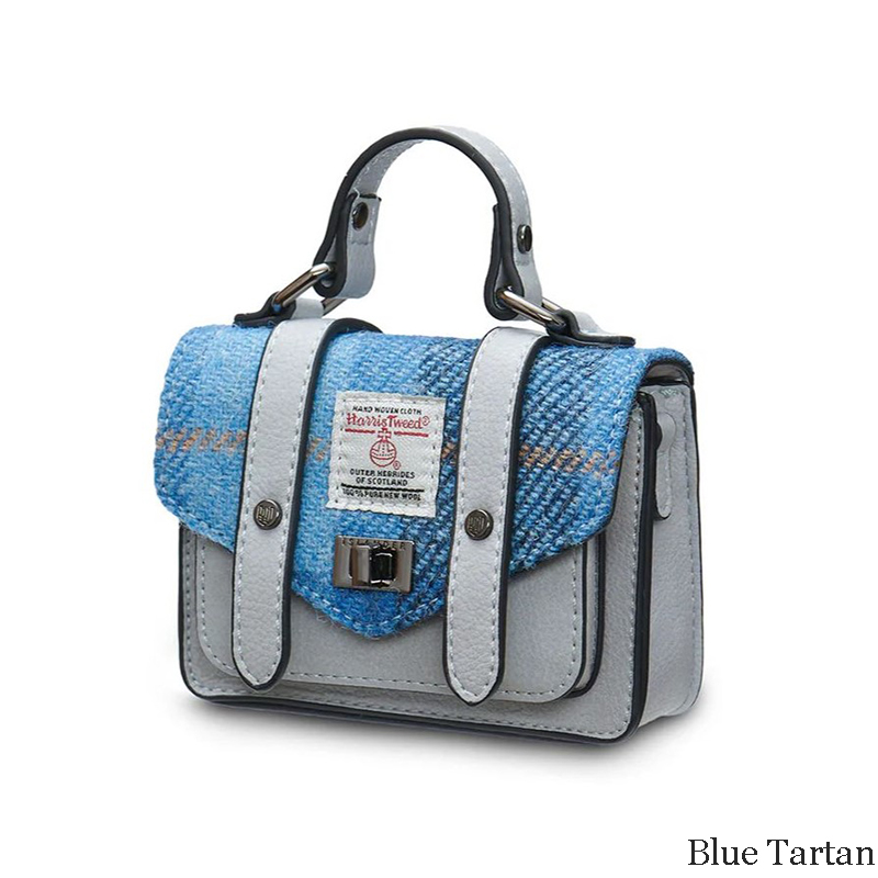 Harris tweed mini satchel sized 3.93" H, 5.11" L, 2.36" W, with a detachable strap