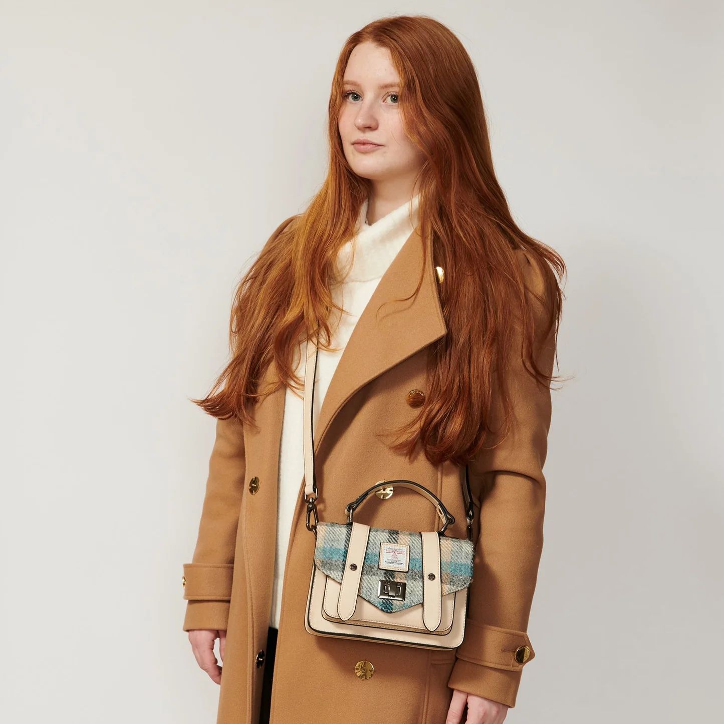 Our Handcrafted Harris Tweed Mini Satchel is a bag that brings a touch of Scotland’s heritage right into your daily style. It’s made with genuine Harris Tweed, a woolen cloth handwoven by skilled artisans in the Outer Hebrides of Scotland. This isn’t just a pretty yarn – it’s known for its durability, resisting wear and tear, and it even repels moisture to keep up with you, rain or shine.